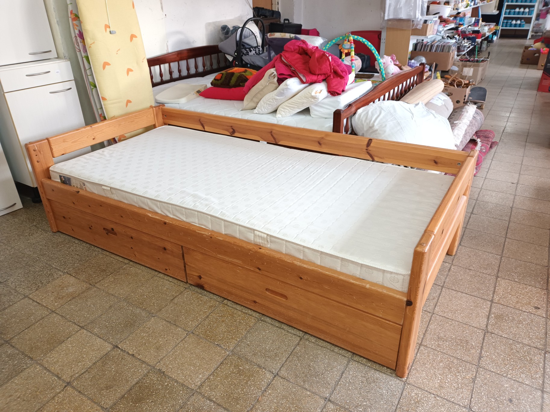 Postel z masivu borovice s roštem,matrací a šuplíky. 200/90 cm.2390 Kč.